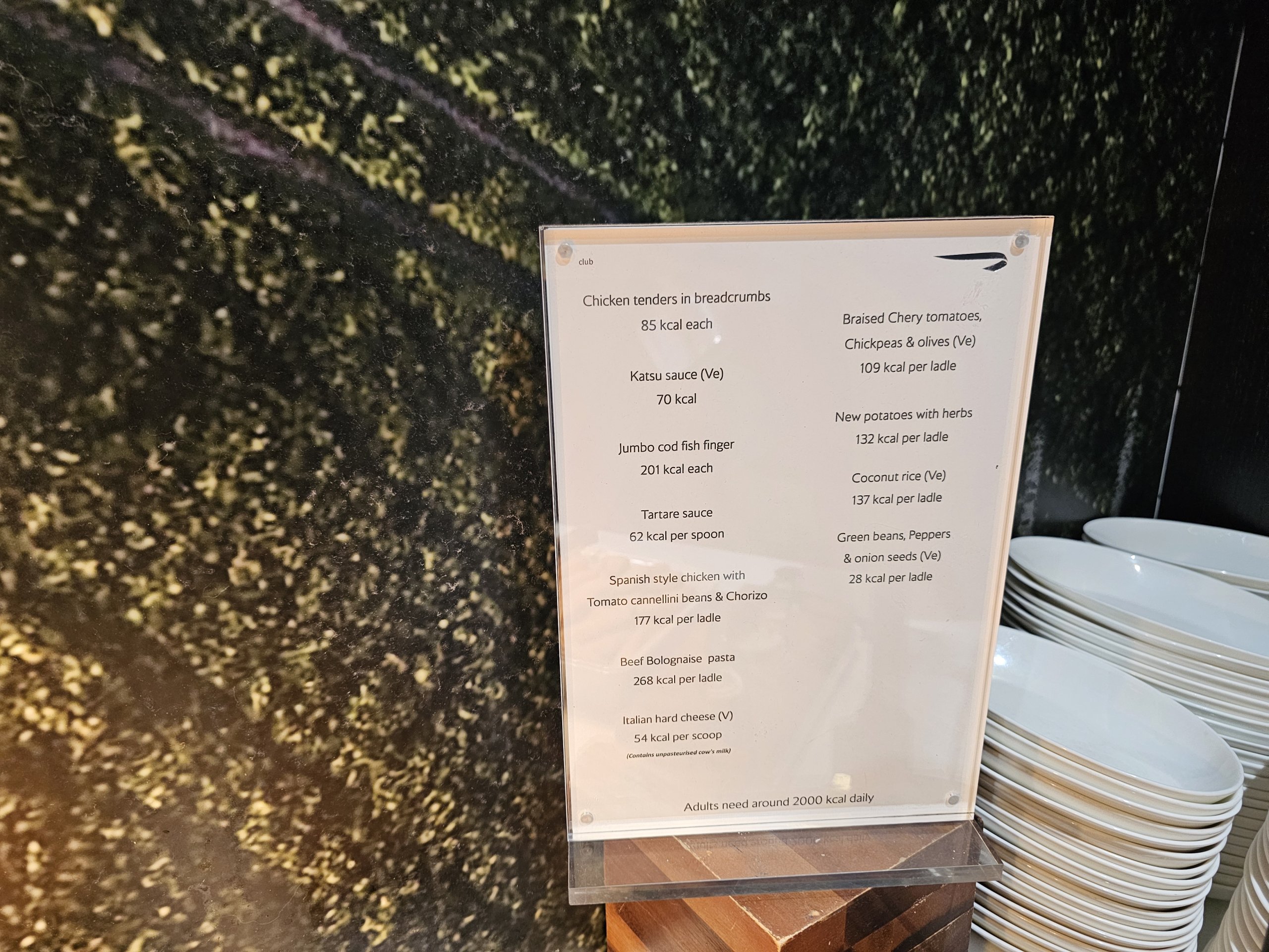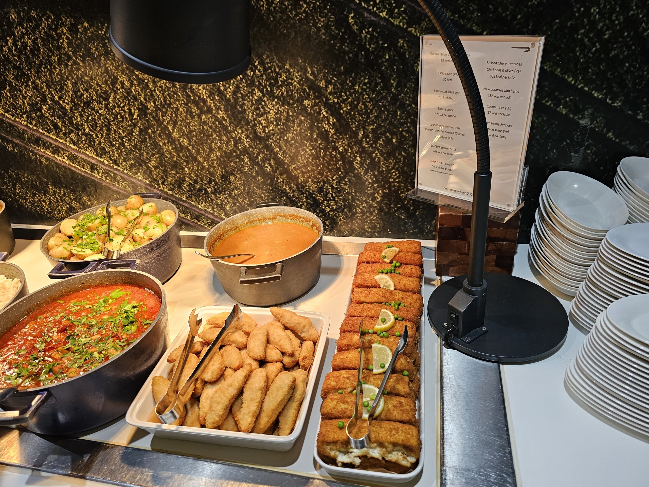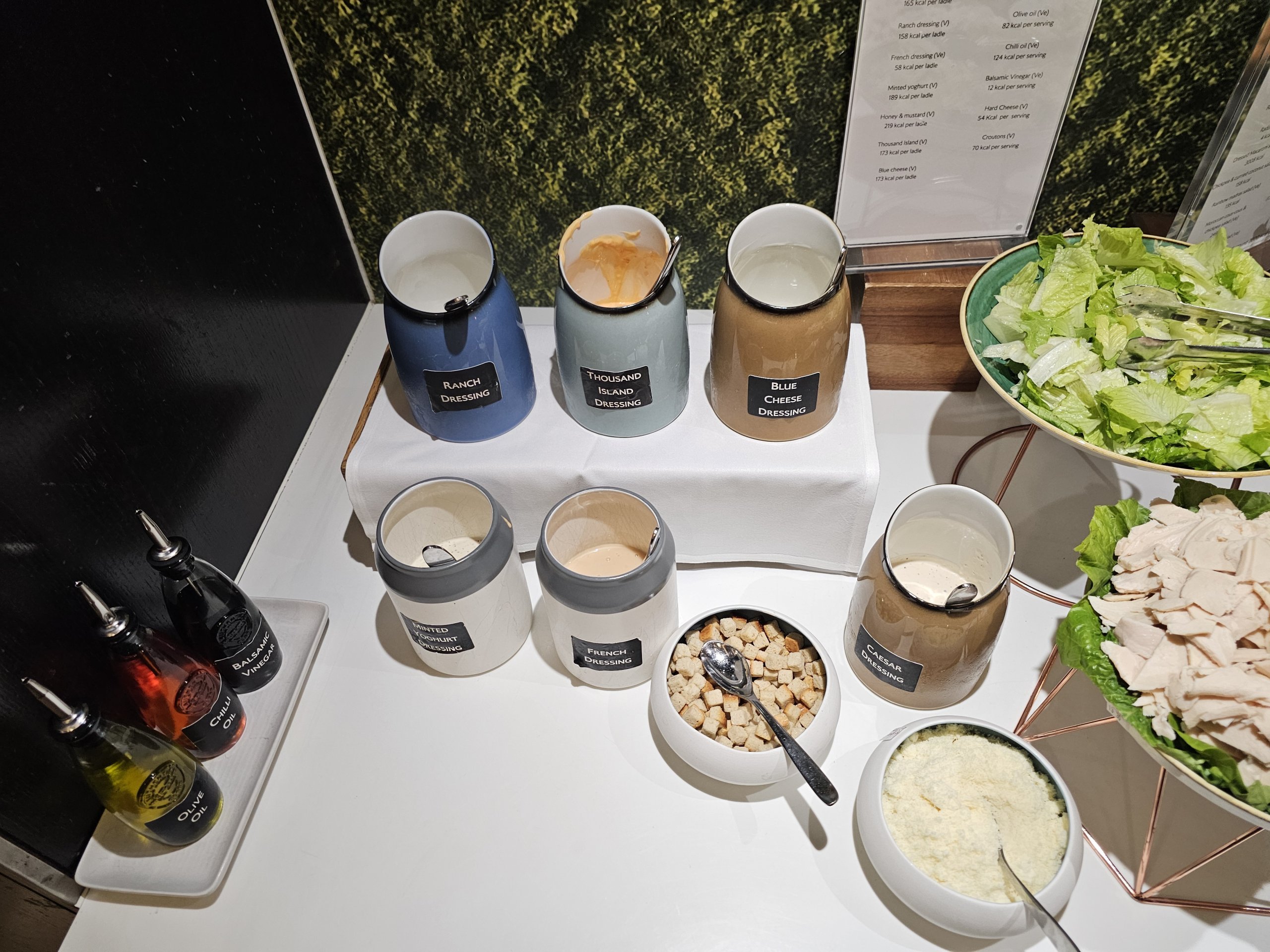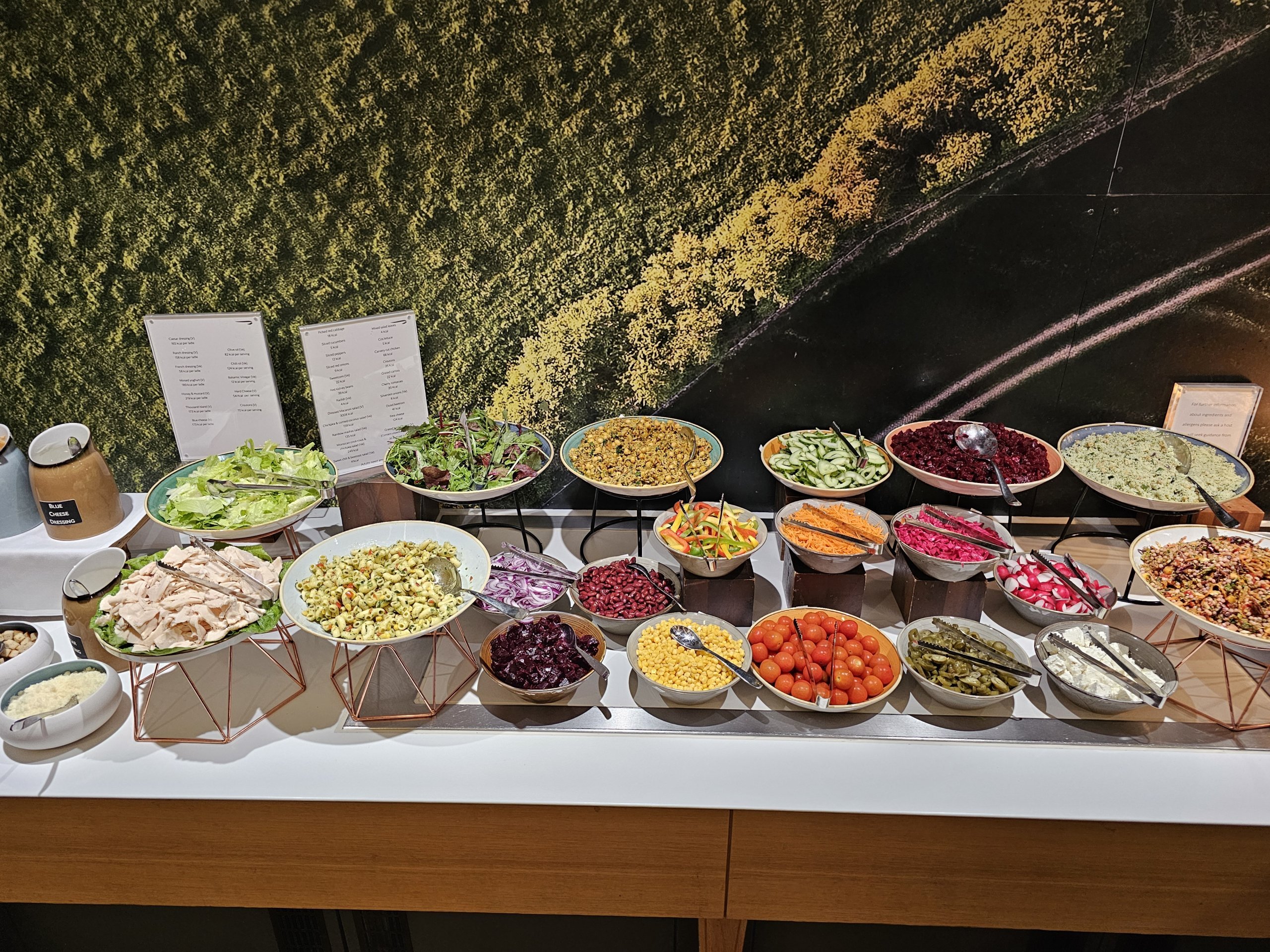 Külma toidu menüüs on mõned köögiviljad, salat erinevate kastmete valikuga ja väga piiratud ja nõrk valik saiakesi (praktiliselt ainult magusad).