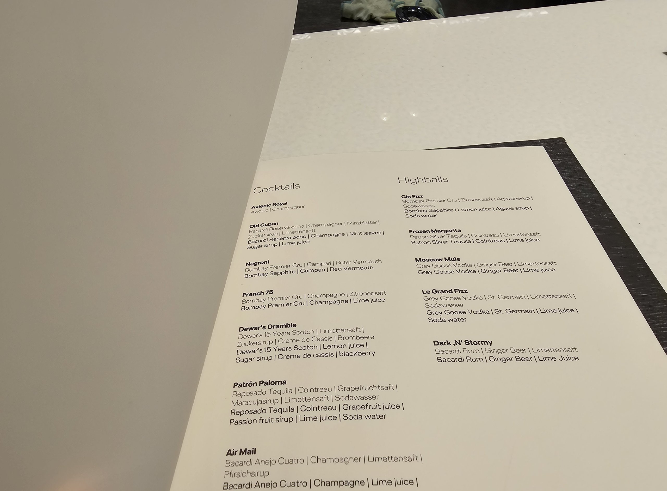 Jätan eelroa vahele ja võtan pearoaks veiselihapraadi koos ühe klassikaga - Lufthansa signatuurkokteiliga nimega Avionic.