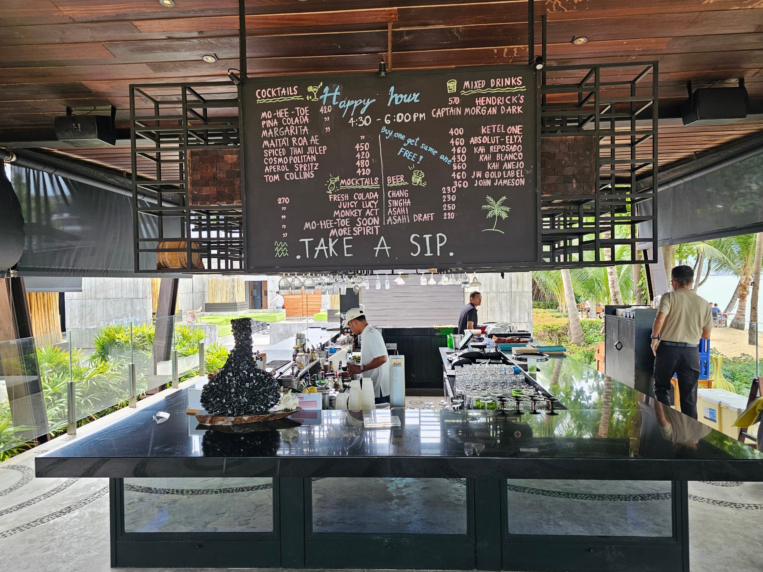 Standardset baari täiendab suur ümmargune "bassein", mille peaaegu pinna alla vajunud diivanid ja täht "W". Hingematvad vaated merele ja lähedalasuvale Koh Phangani saarele täiendavad atmosfääri.