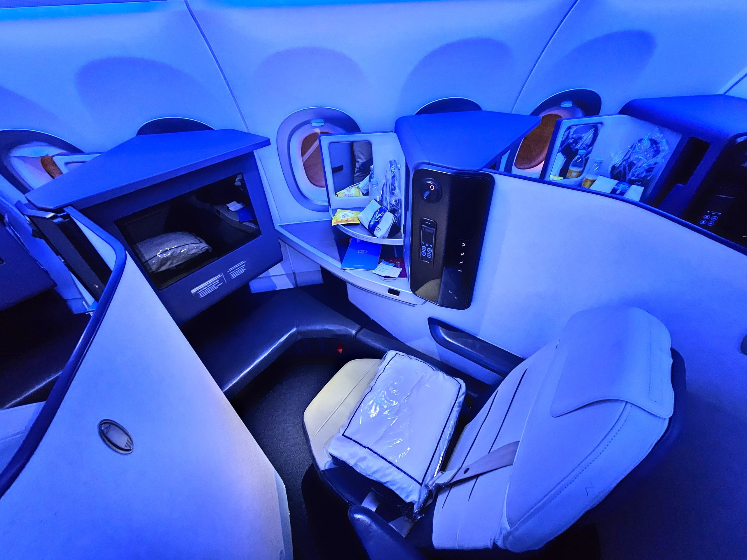 Päris äriklassi istmed, mis on voodi asendisse tagasi lükatavad regionaalses kitsarööpmelises lennukis. Ja mis veelgi enam, sellise ilusa ja elegantse disainiga, kus domineerivad valge ja peenike tumesinine ääristus.
