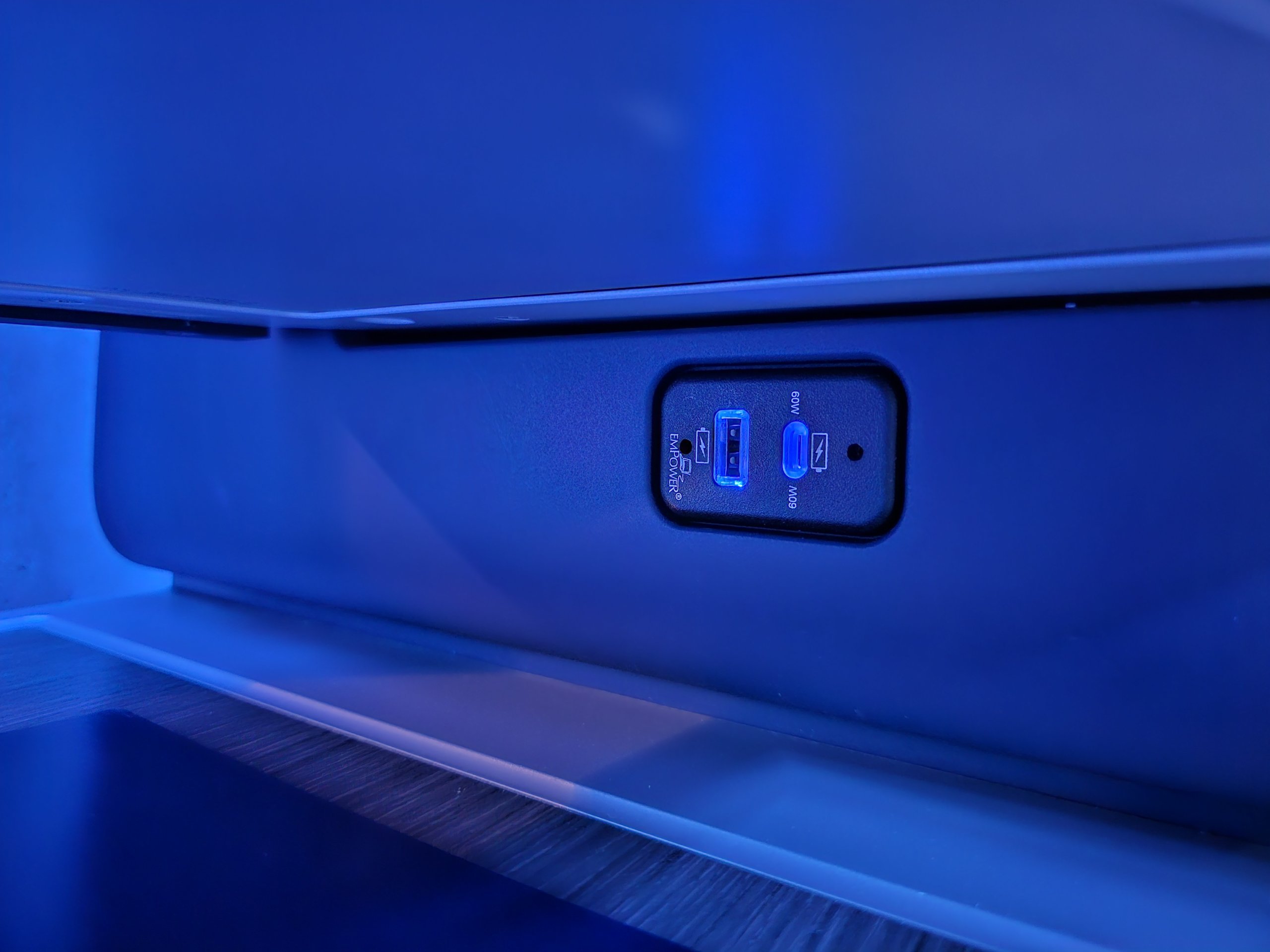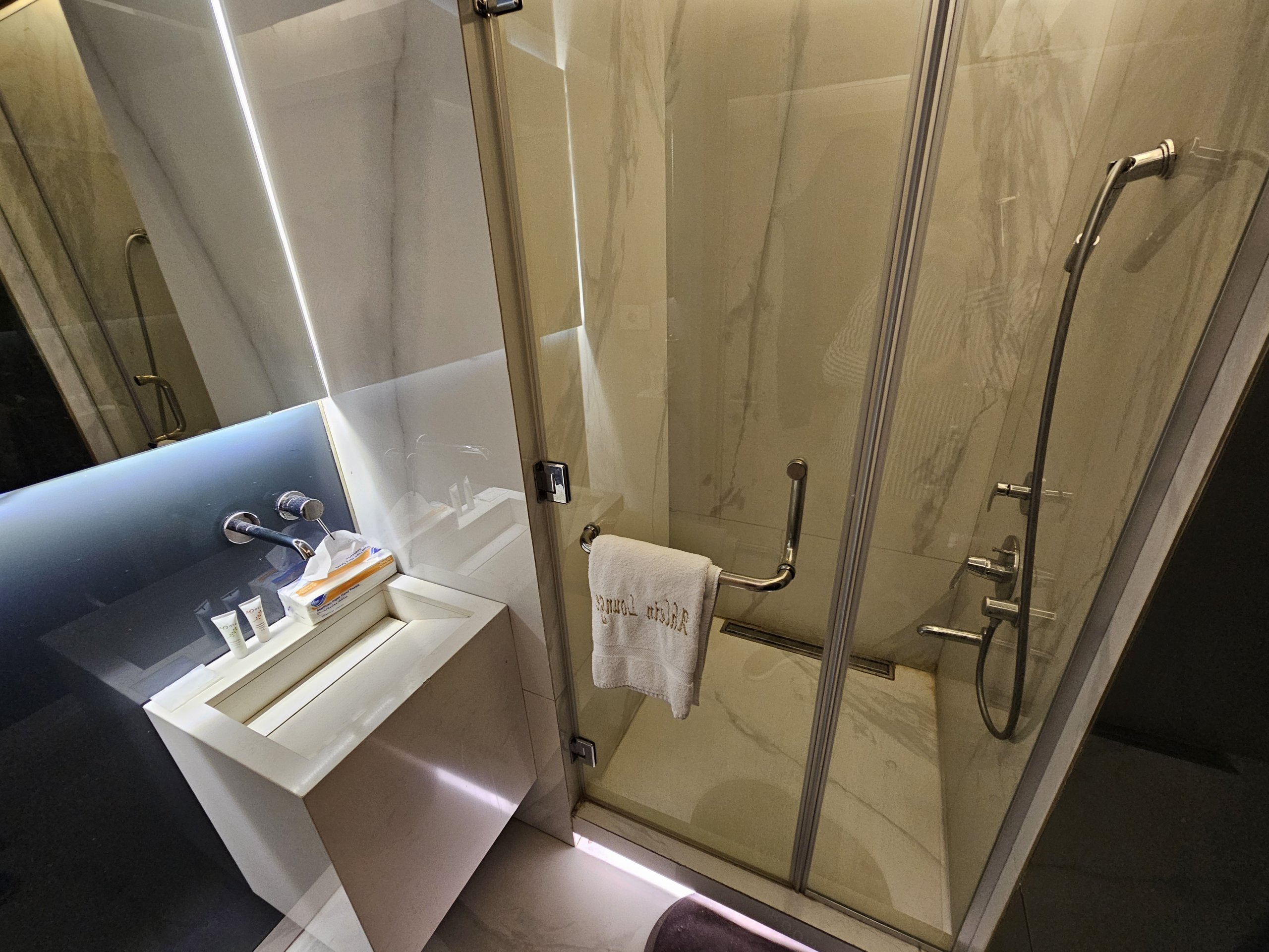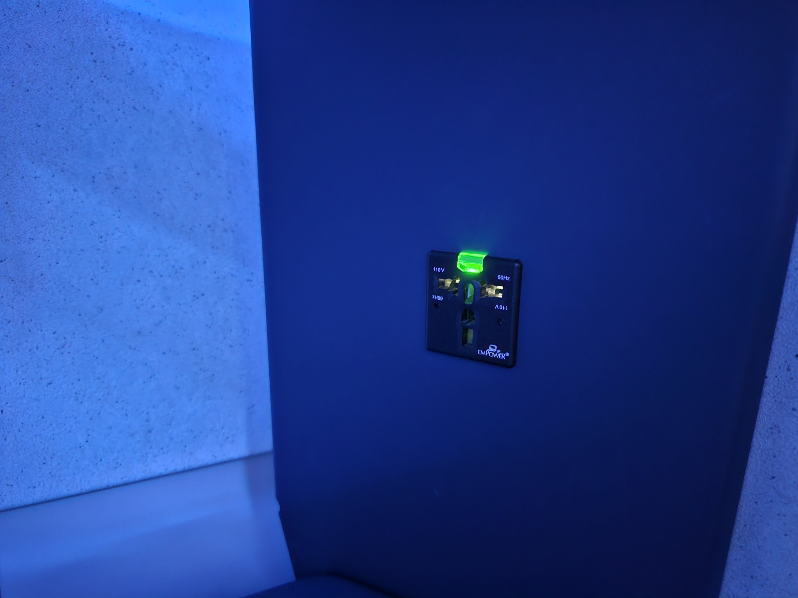 Elegantset atmosfääri rõhutab sinine öine valgustus, sest meie lend väljub kell 4:35 hommikul.