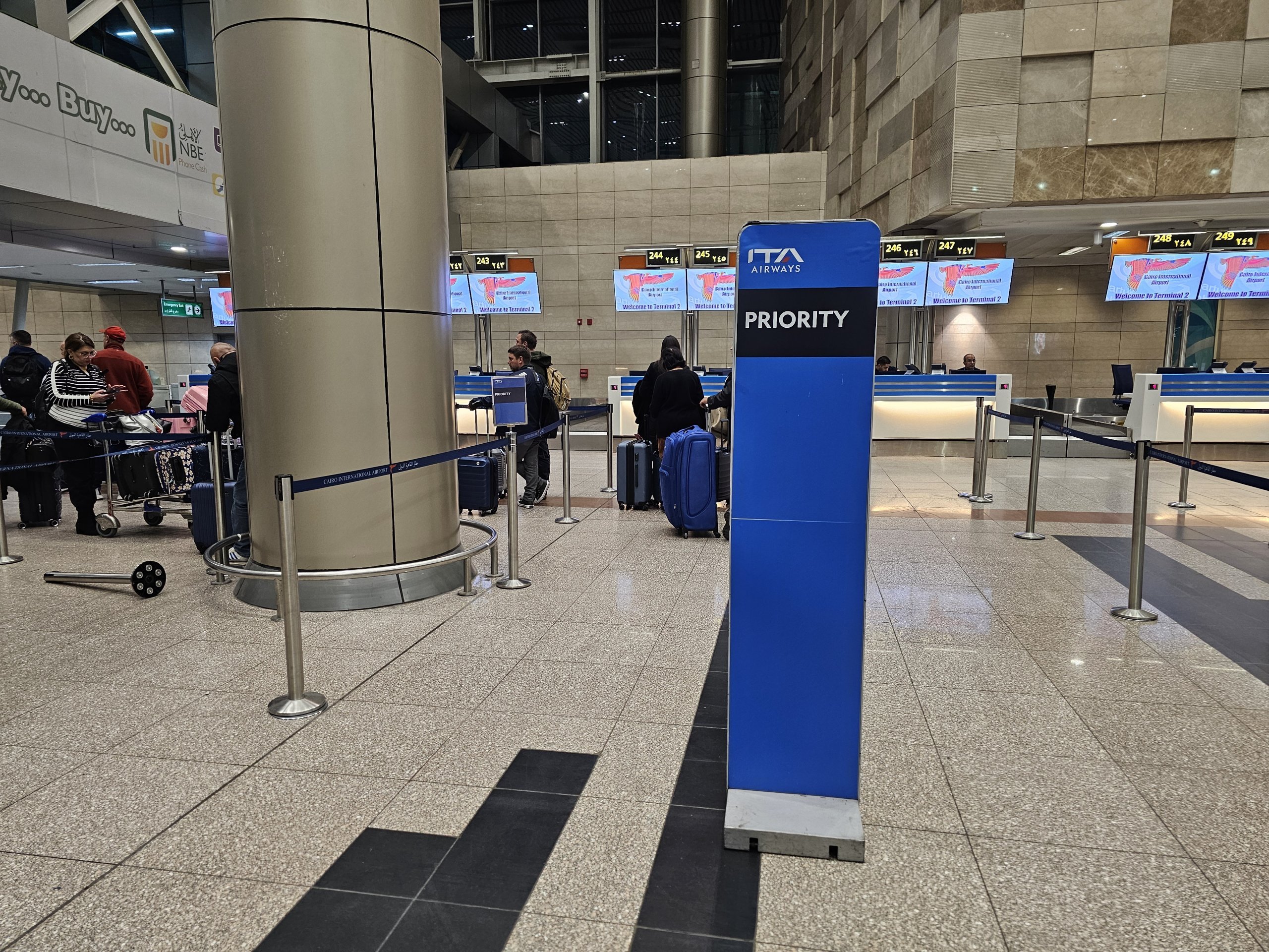 Registreerun Kairo lennujaamas, kus ITA Airwaysil on 2. terminalis 5 spetsiaalset registreerimislauda.
