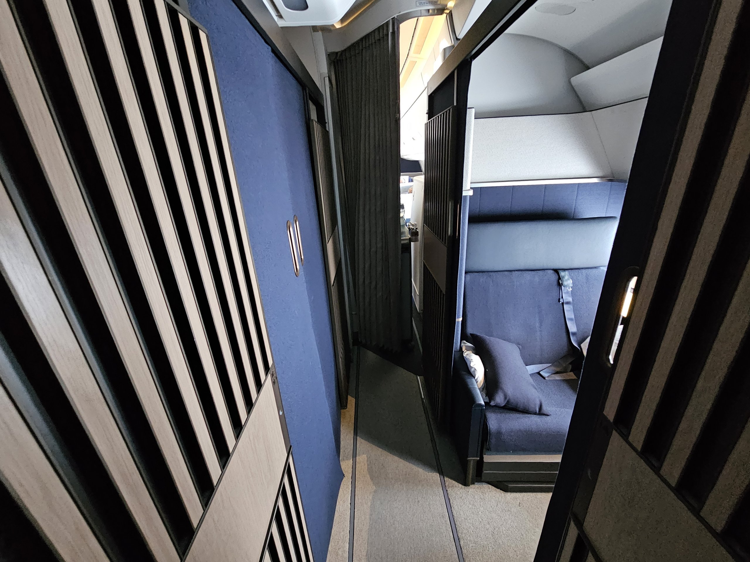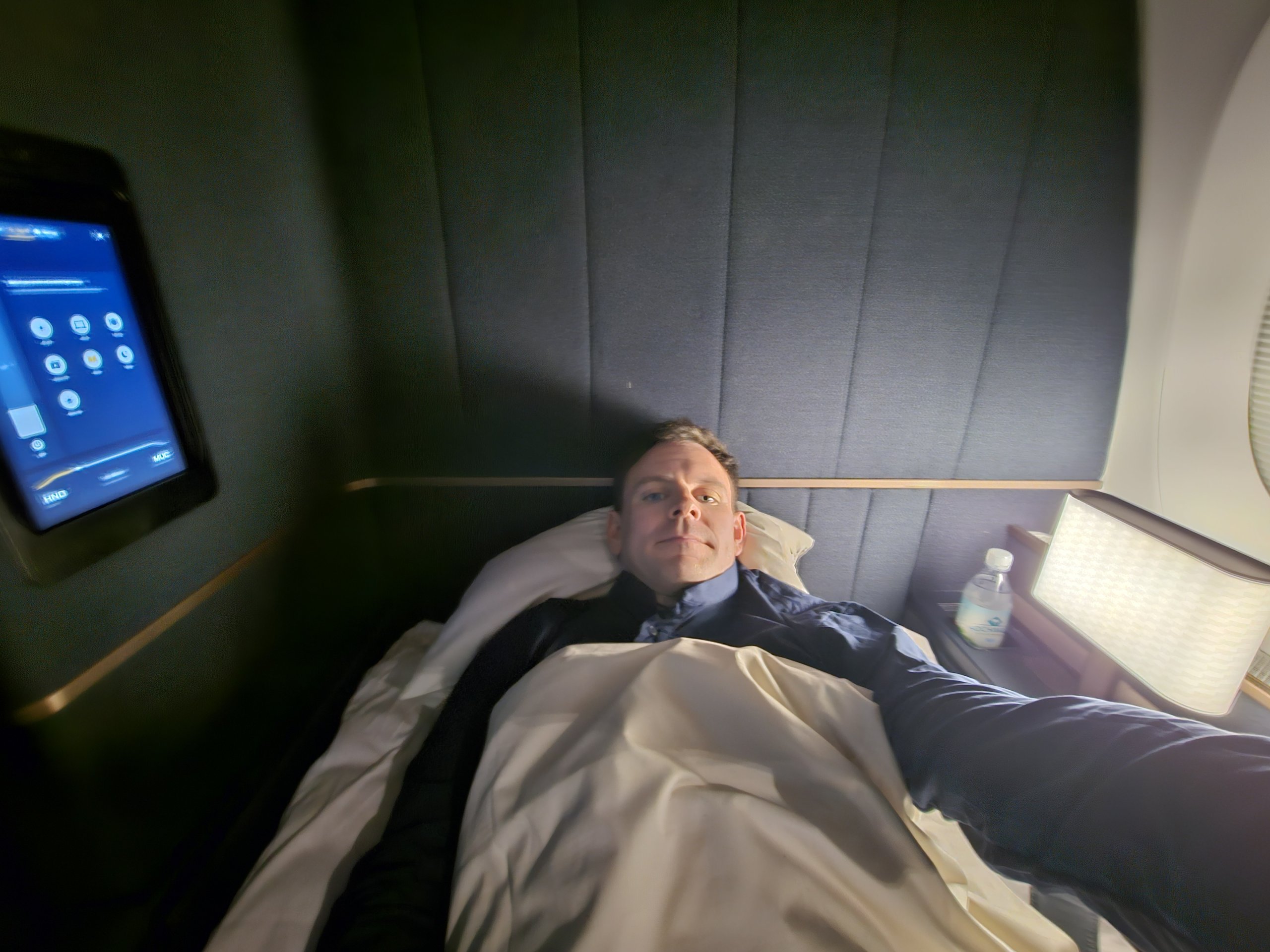 Nii et varsti pärast lõunat lähen tualetti, et vahetada oma pidžaamad ümber. Vahepeal valmistab abivalmis stjuardess minu voodit ette (istme saab ise nupuvajutusega lahti voltida, kuid linad ja tekk on paigutatud lahtritesse, kuhu pääseb ligi ainult meeskond).