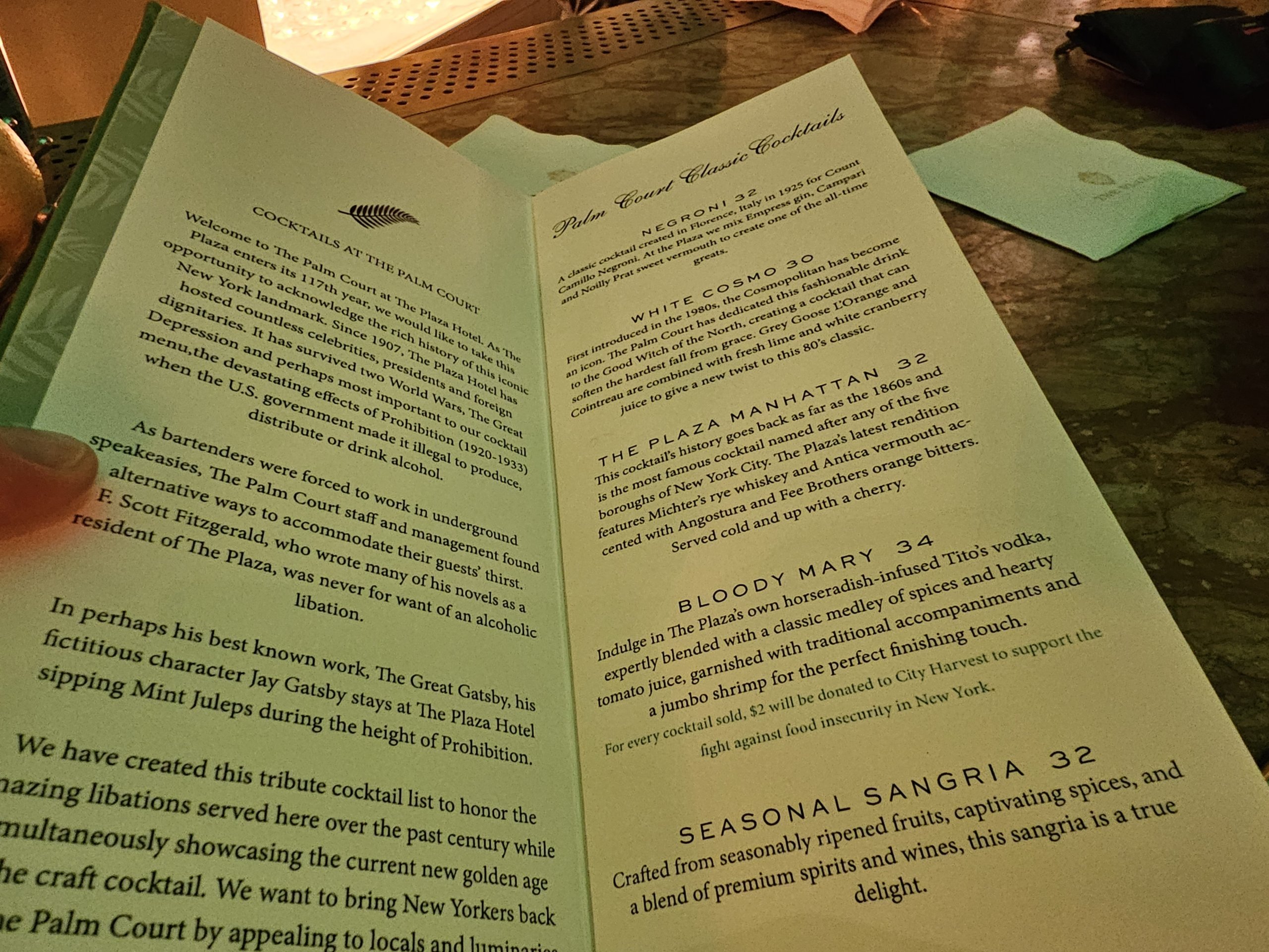 Teisel õhtul läheme Palm Court restorani kahele joogile, mis on suurepärased.