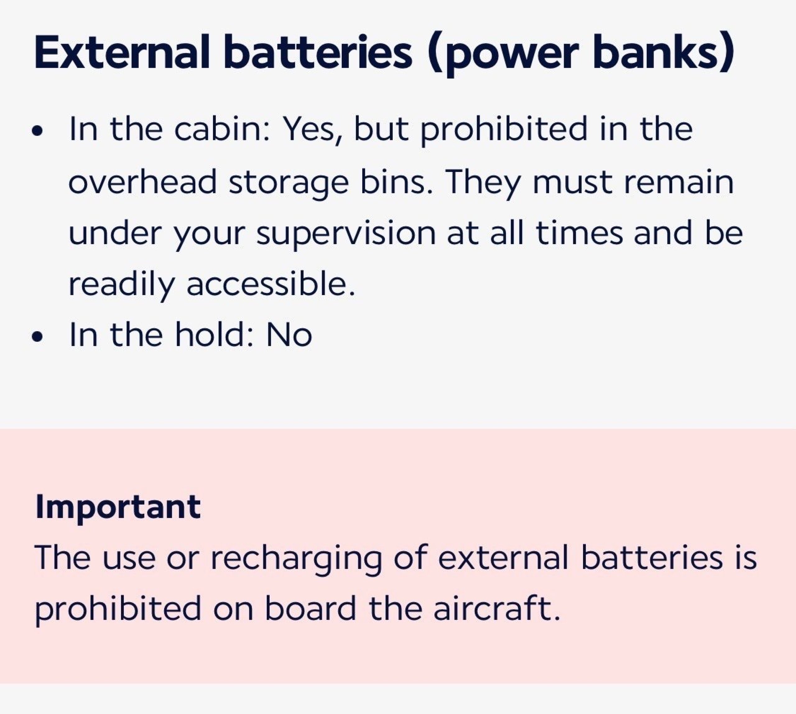Mõne lennufirma puhul (vt loetelu käesoleva artikli lõpus) peate oma elektripanga hoidma väljaspool käsipagasit - näiteks teie ees olevas istmetaskus, mitte pagasikambris.