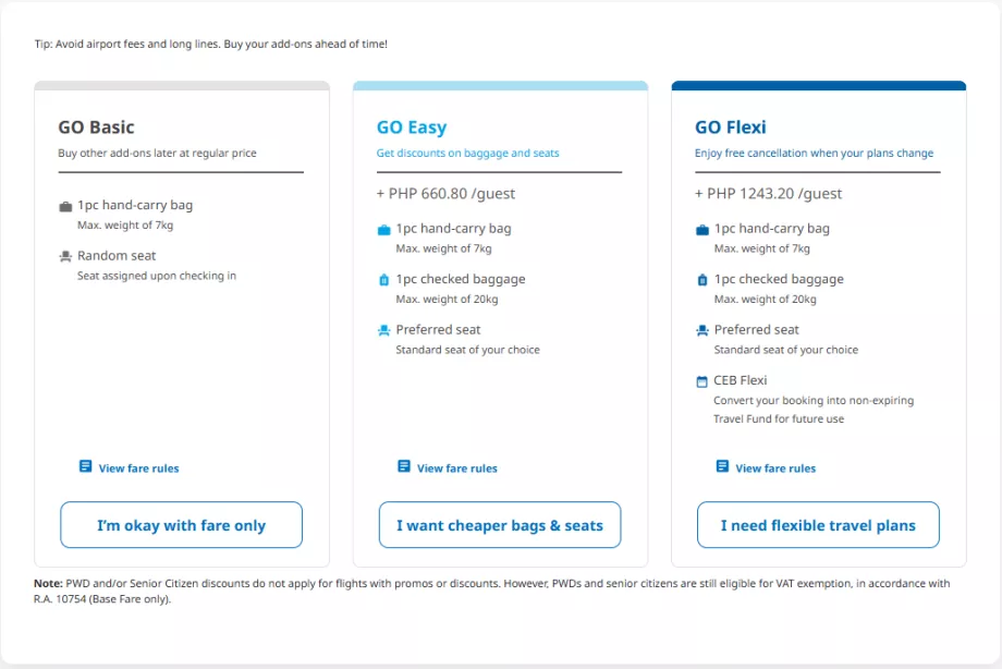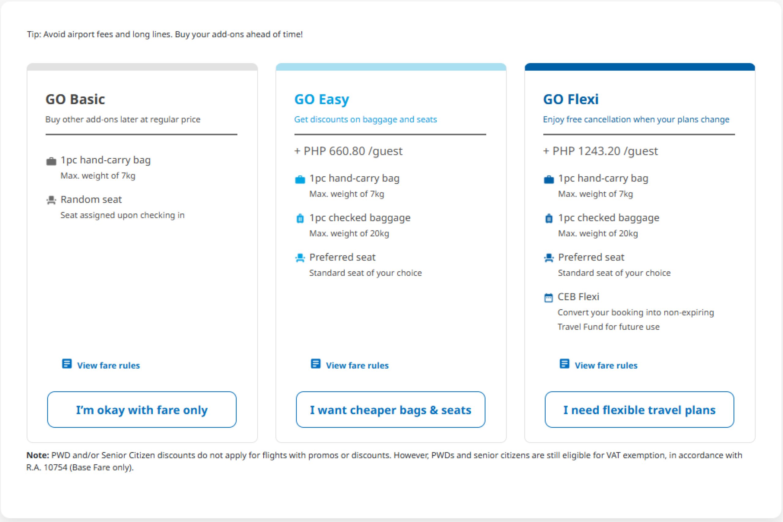 - GO Flexi - Tasuta registreeritud pagas (20 kg) ja käsipagas, tasuta istekoha valik, tasuta tühistamine (raha tagastatakse Cebu Pacificu krediidina edaspidiseks kasutamiseks.