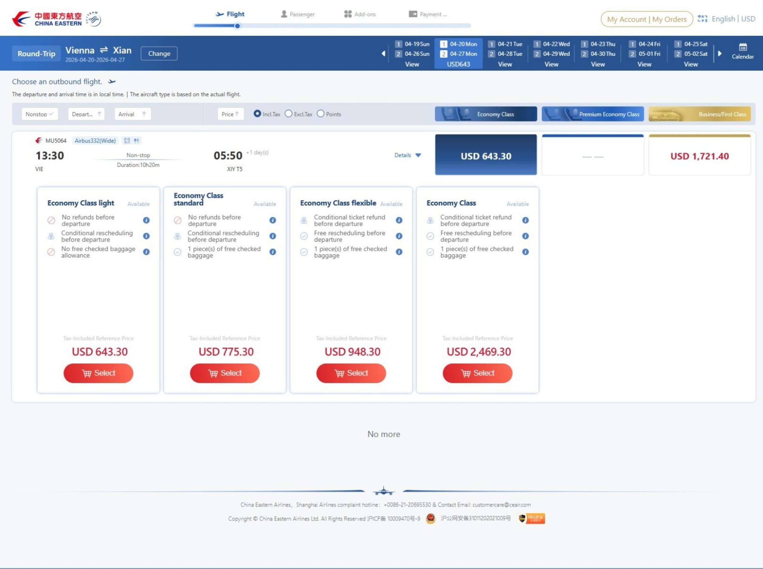 China Eastern alustab 20. aprillil lendamist Viini ja Xi'ani vahel.
