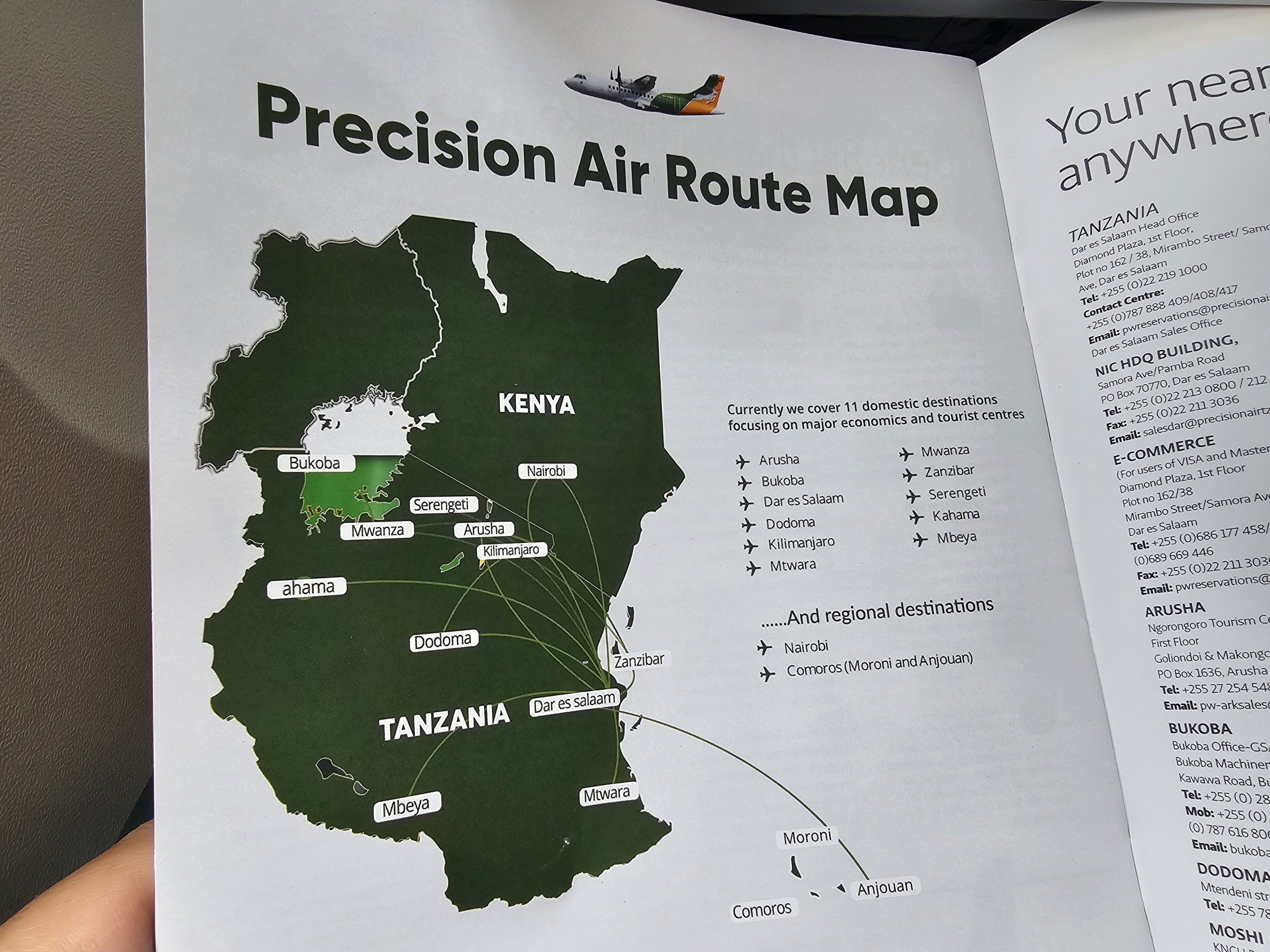 Precision Air on võrgustiku lennufirma, mis pakub jätkulende lennujaamade kaudu. Dar es Salaam DAR või, Kilimanjaro JRO või Zanzibar ZNZ.