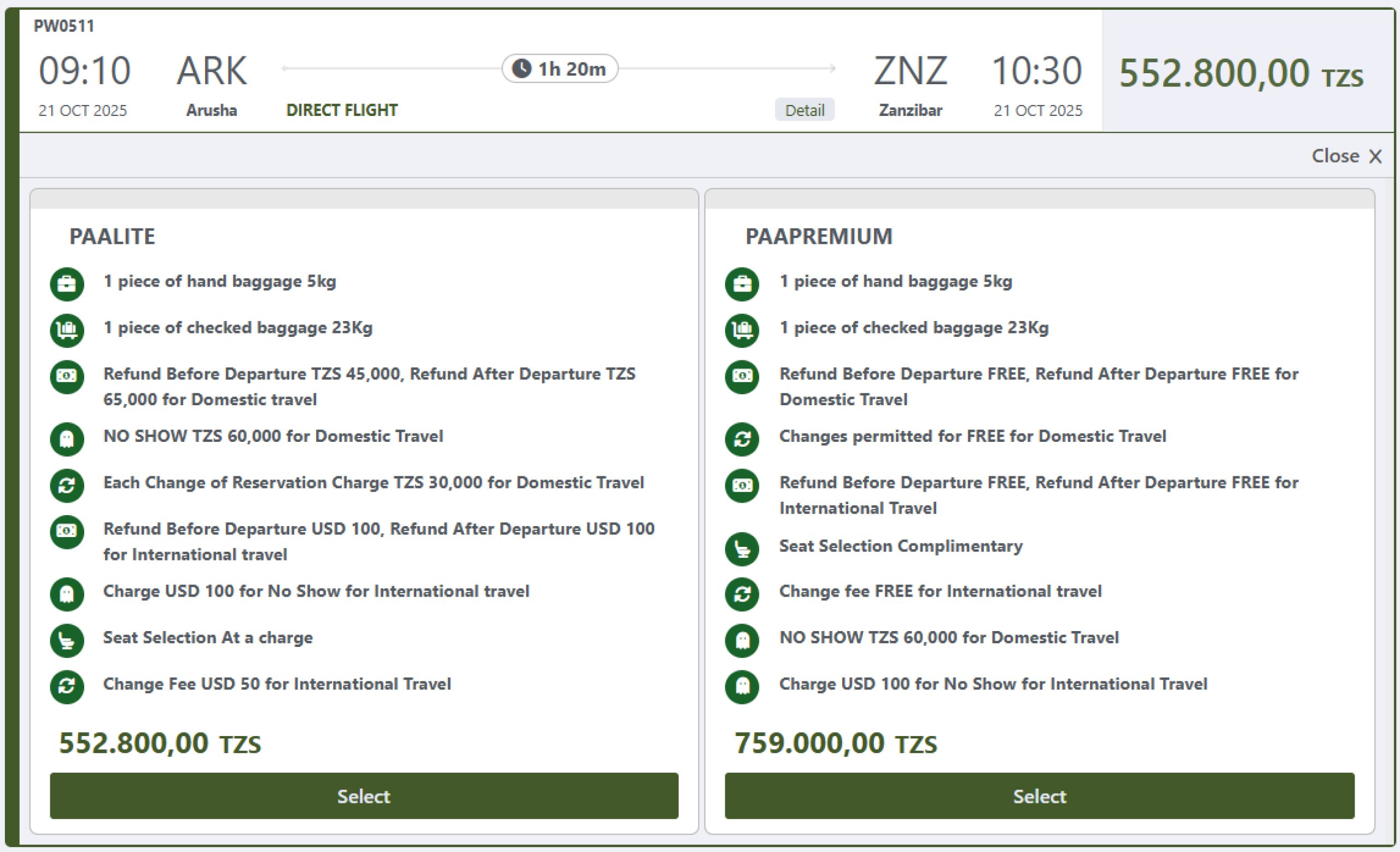 Kuna Precision Airil on mitmetel Tansaania liinidel konkurents teiste lennufirmade poolt, tasub hindu võrrelda lennuvõrdlusportaalide kaudu.