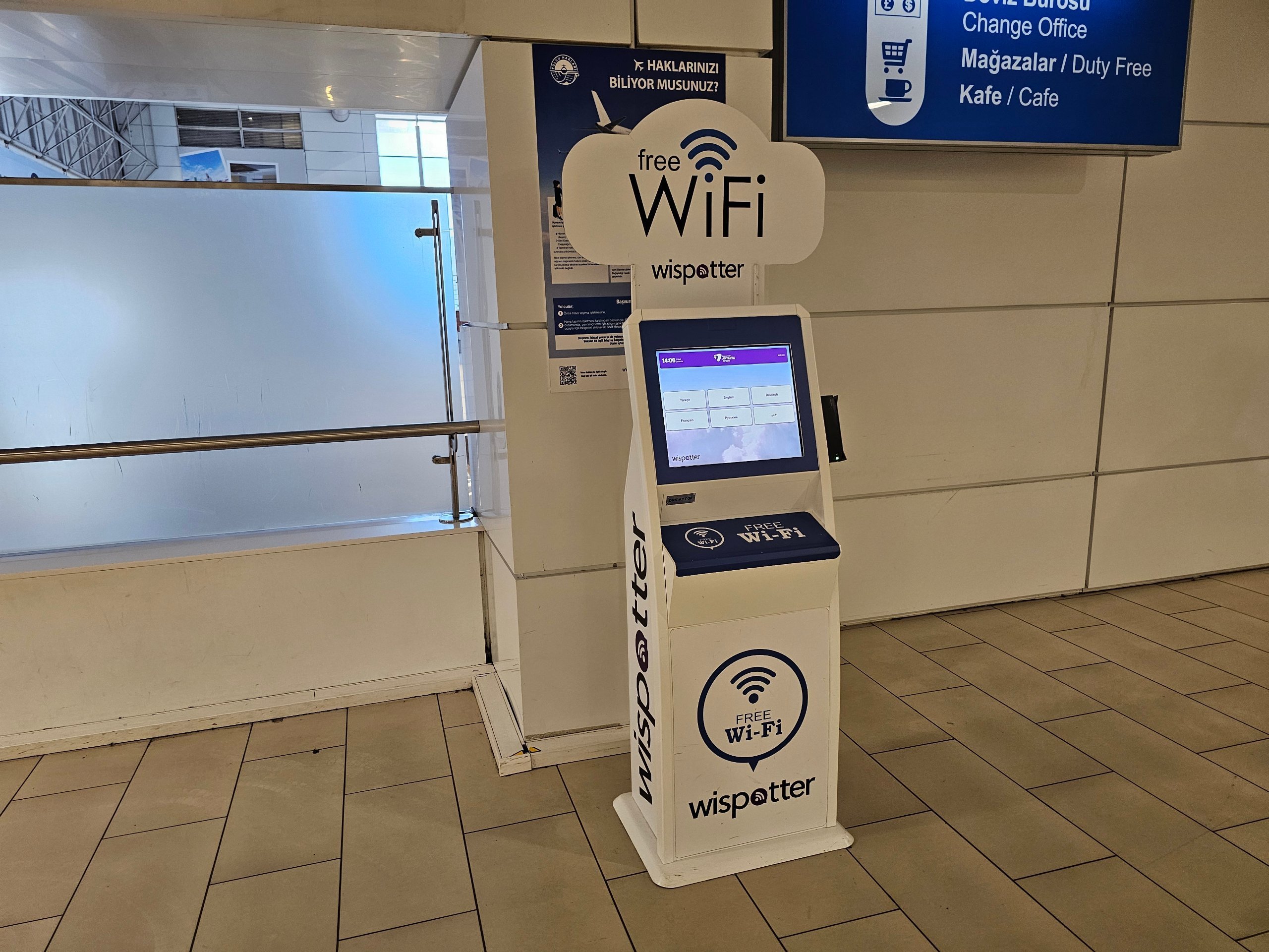 Tasuta WiFi-ühendus on saadaval ainult 60 minutit. Parooli saab ainult lennujaamas asuvatest ametlikest kioskitest, kuhu tuleb sisestada kas reaalne telefoninumber või skaneerida oma pass.