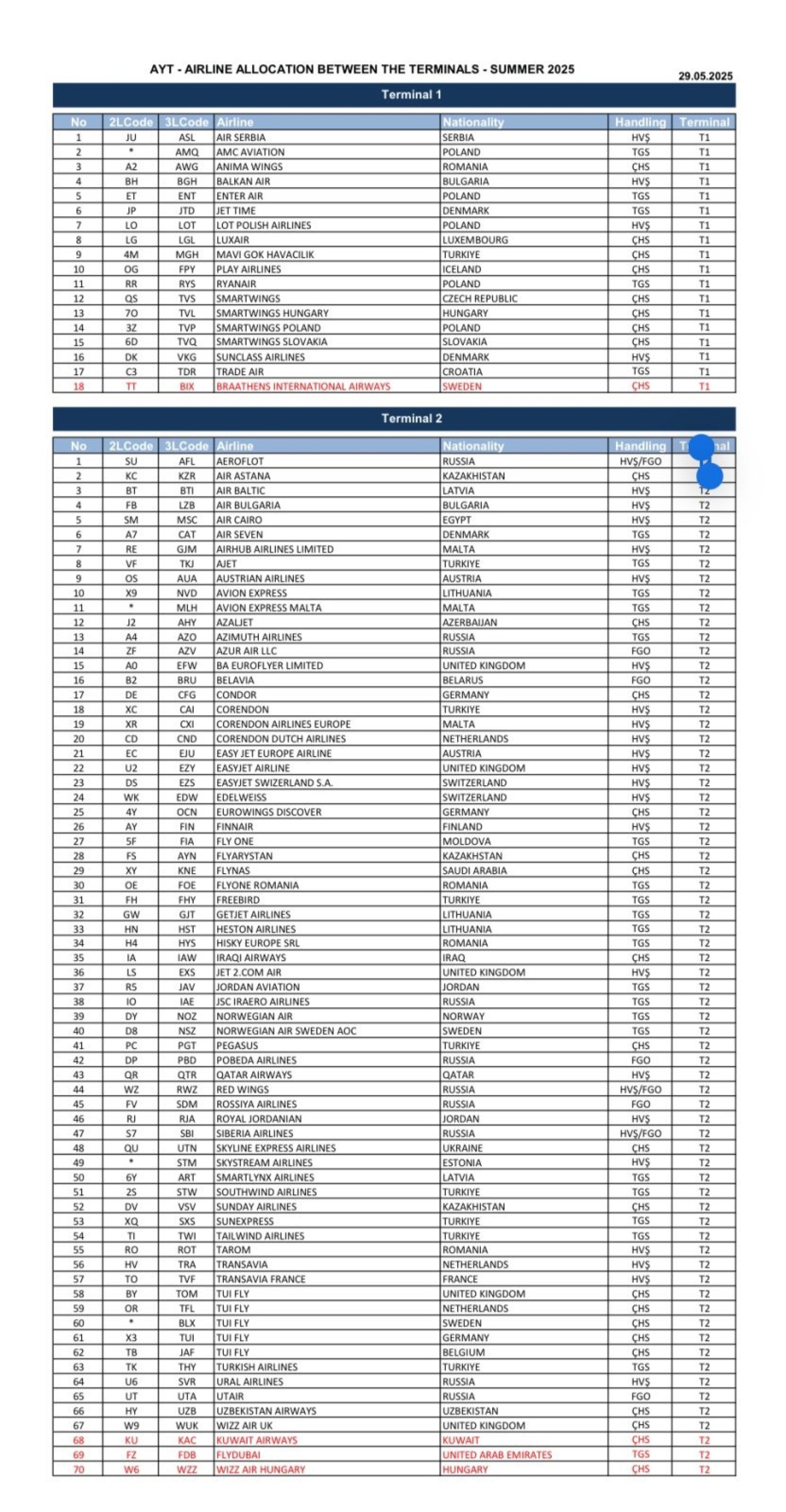- Terminal 2 - Air Astana, airBaltic, Air Cairo, Bulgaria Air, AJet, Austrian, Avion Express, British Airways, Condor, Corendon Airlines, easyJet, Edelweiss Air, Eurowings, Finnair, FlyOne, Fly Arystan, Flydubai, Flynas, Freebird Airlines, GetJet Airlines, Heston Airlines, Hisky, Iraqi Airways, Jet2.com, Jordan Aviation, Kuwait Airways, Norwegian, Pegasus Airlines, Qatar Airways, Royal Jordanian, Skyline Express Airlines, Smartlynx Airlines, Southwind Airlines, Sunday Airlines, SunExpress, Tailwind Airlines, Tarom, Transavia, Tui Fly, Turkish Airlines, Uzbekistan Airways, Wizz Air, Usbekistan Airways.