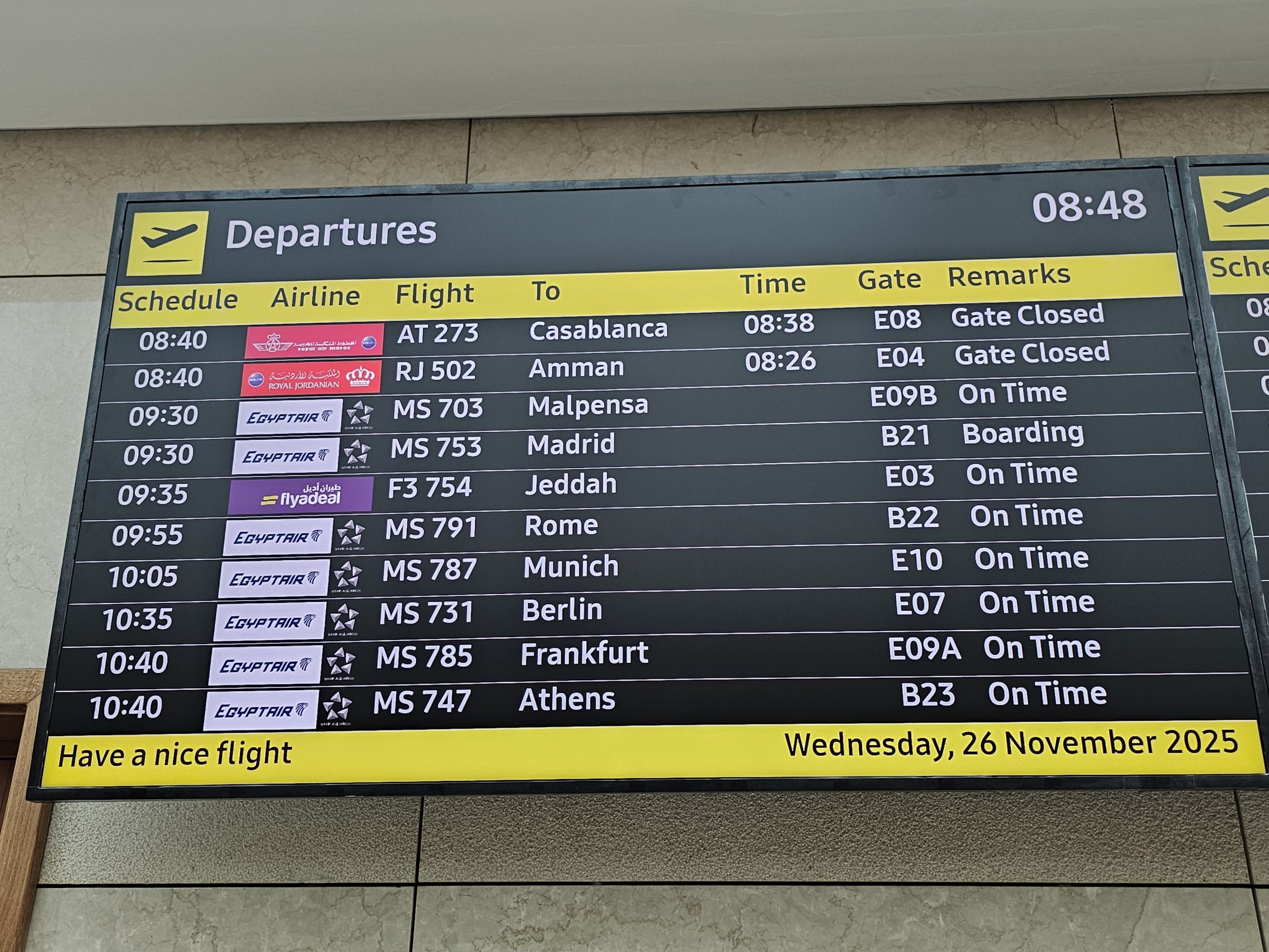 Otsite reaalajas saabuvaid või väljuvaid lennuliine Kairo lennujaamast või lennujaama, et kontrollida hilinemisi või pardale mineku aega? Lennujaama ametlikul veebisaidil on alati kõige täpsem teave: