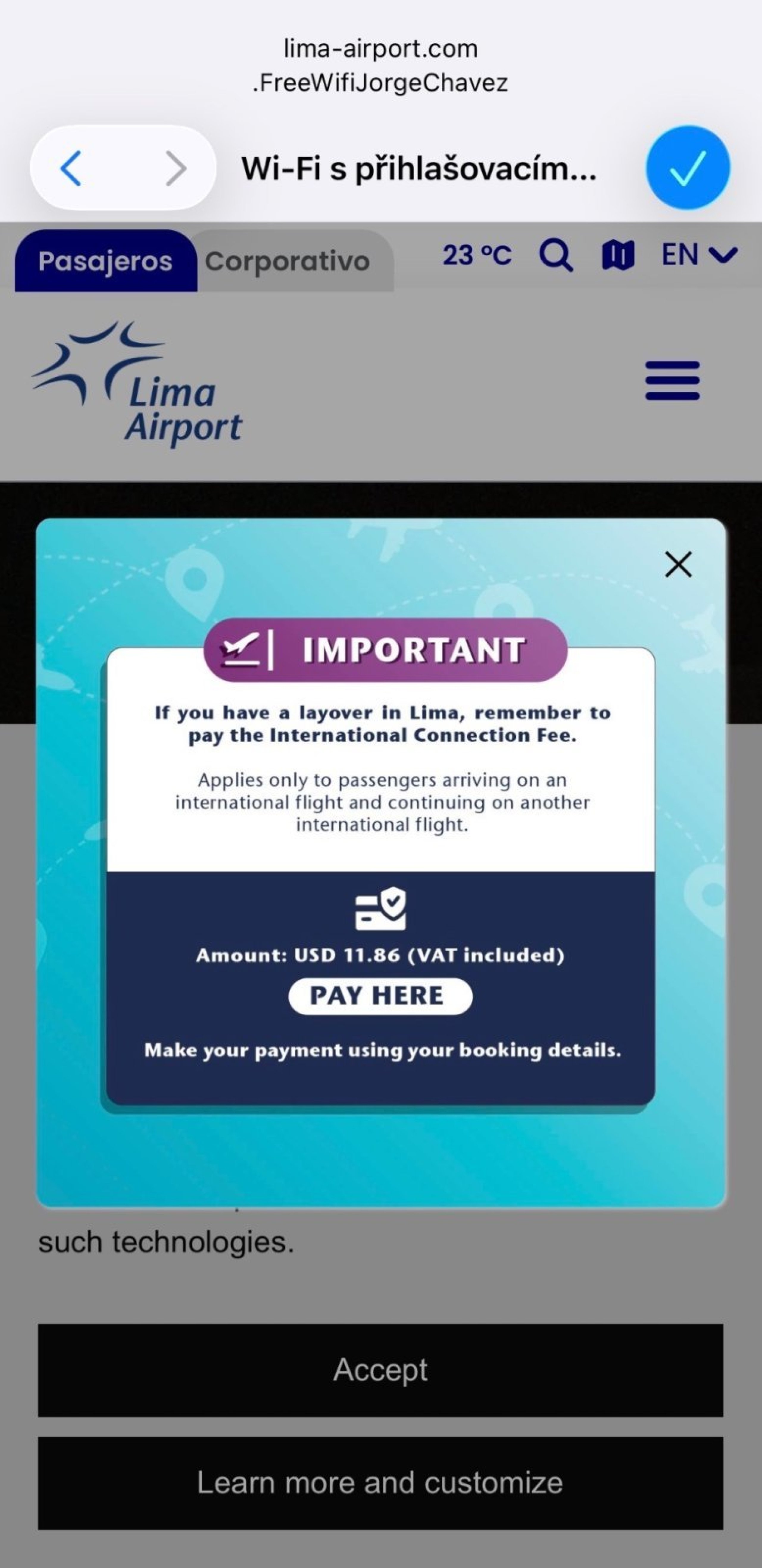 Kahjuks nõuab Lima lennujaam (LIM) alates 7.12.2025. aastast 11,86 USA dollari suurust transiiditasu (TUUA) jätkulendudelt.
