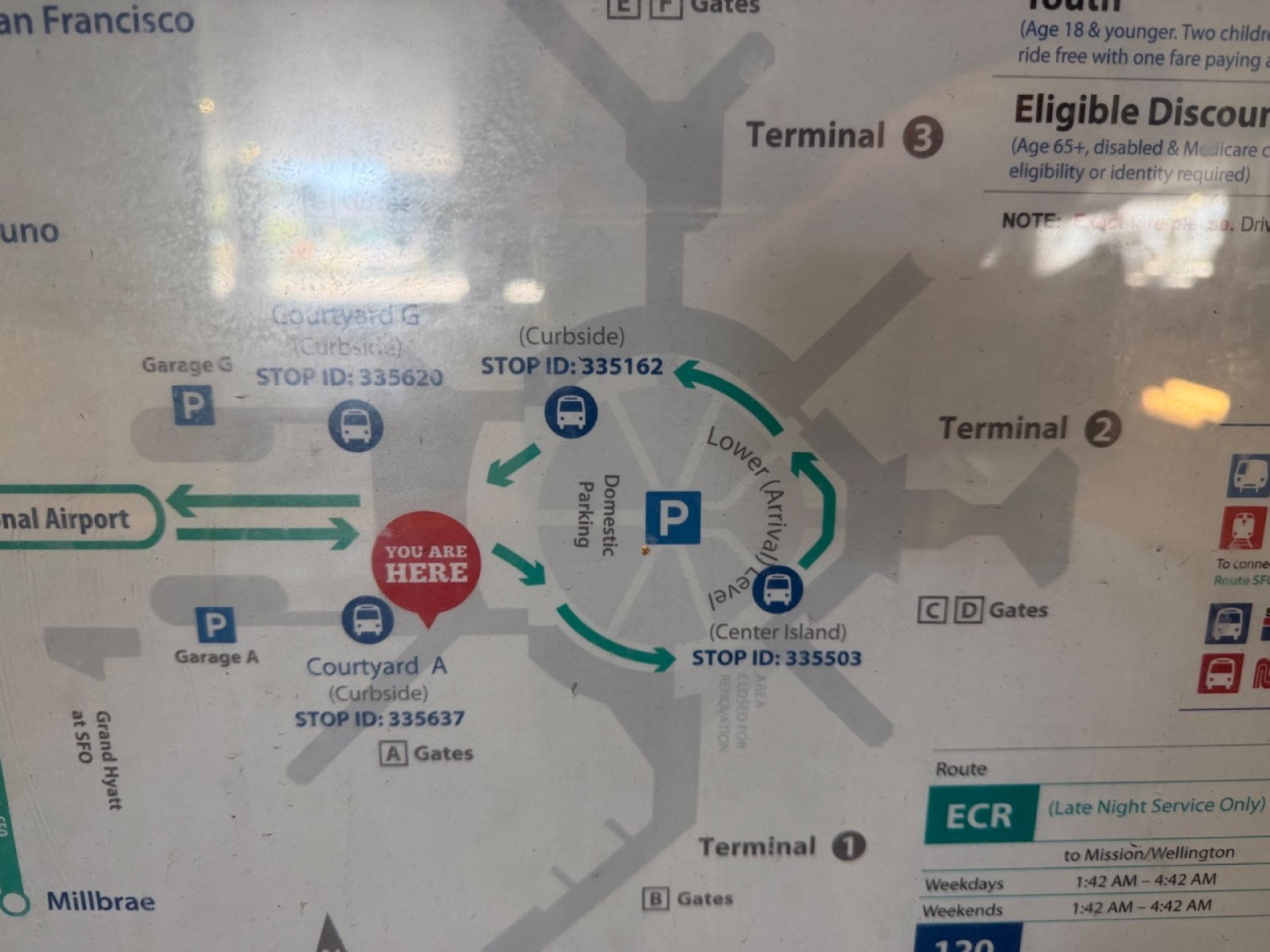 Viimased rongid lennujaamast San Franciscosse ja Oaklandi sõidavad vastavalt kell 0:00 (kollane liin) ja 20:59 (punane liin).