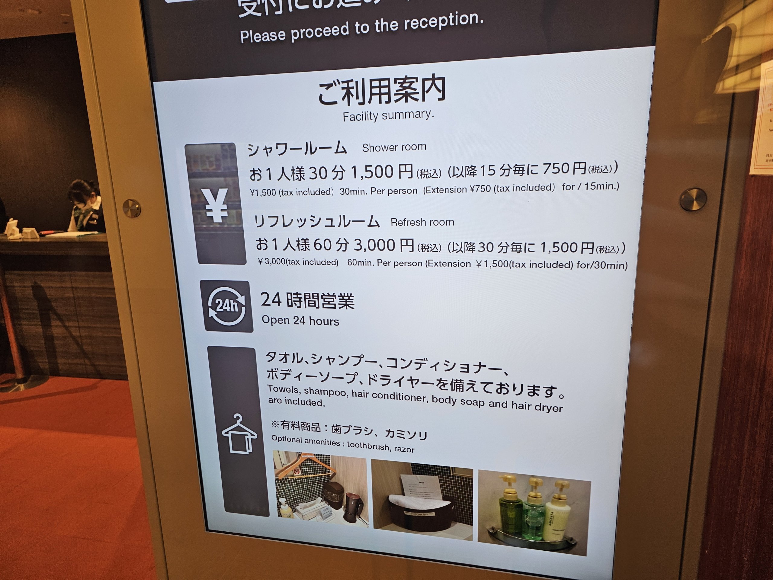 - Duširuum - avalik ala, saabuvate lendude 1F, avatud 5:00-10:00/16:00-22:00, 30-minutilise duši kasutamise tasu 1 500 jpy.