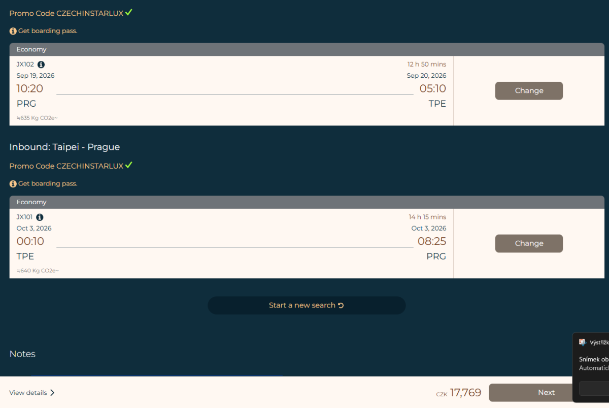 Taipei - Praha: 00:10-07:50